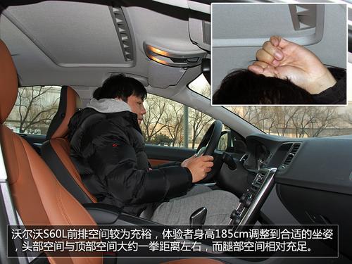 沃尔沃S60L前排空间较为充裕,体验者身高185cm调整到合适的坐姿,头部空间与顶部空间大约一拳距离左右,而腿部空间相对充足。