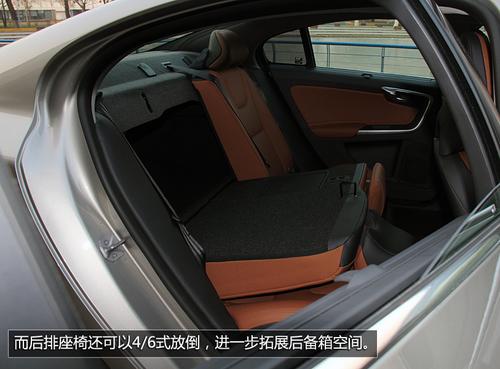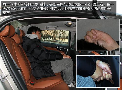 同一位体验者转移至到后排,头部空间与顶部大约一拳距离左右,由于沃尔沃S60L轴距经过了加长处理之后,腿部与前排座椅大约两拳距离左右,同时,后排座椅还可以4/6式放倒,进一步拓展后备箱空间。