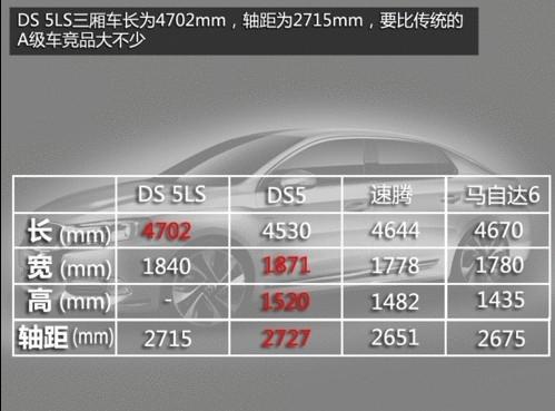 DS 5LS首款三厢车车长为4702mm,车宽为1840mm,轴距为2715mm,要比一般的紧凑A级车大不少,因此我们将其定义为A+级三厢车,而全新的前脸造型看起来更符合中国人的审美,感觉要比DS5前脸好看的多。