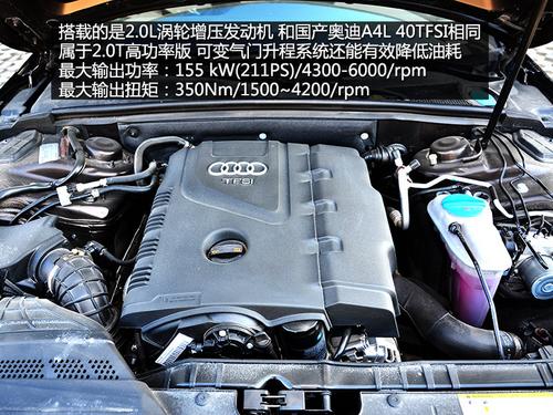 奥迪A4 allroad尾部并没有和国产奥迪A4L一 样标注40TFSI标识,但它搭载的和国产奥迪A4L 40TFSI搭载的发动相同,为2.0T高功率版。最大输出功率为155kW,在1500转就可以爆发350Nm的最大扭矩,并且持续到4200转。但是 不要担心它的油耗,奥迪可变气门升程系统能有效降低油耗,保证它的燃油经济性。7挡S-tronic双离合变速器除了在起步阶段有些拖沓和抖动之外,无论 是升档还是将挡都非常平顺。