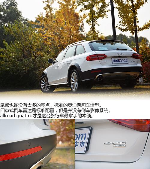尾部也许没有太多的亮点,标准的奥迪两厢车造型。与车头采用相同的金属护板,更好的抵抗坑洼路面对车身的损害,标准的四点式倒车雷达和双出排气筒都让奥迪 A4 allroad的尾部看上去力量十足。尾部独特的标识allroad和quattro,表明这款旅行车不是普通的旅行车,是全路况全时四驱旅行车。