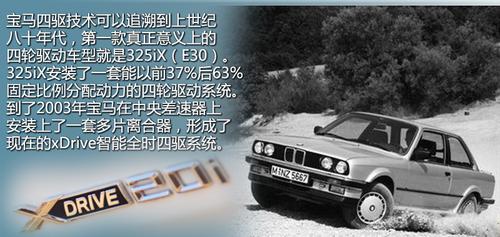 宝马四驱技术可以追溯到上世纪八十年代,第一款真正意义上的四轮驱动车型就是325iX(E30)。325iX安装了一套能以前37%后63%固定比例分配动力的四轮驱动系统。到了2003年宝马在中央差速器上安装上了一套多片离合器,形成了现在的xDrive智能全时四驱系统。