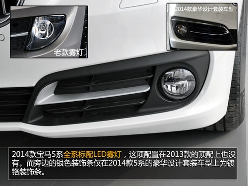 2014款宝马5系全系标配氙气大灯和LED日间行车灯,并带有大灯高度调节和清洗功能。同时,2014款5系大灯的内部结构进行了调整,采用了宝马家族最新的上下扁平天使眼大灯,灯眉不再是装饰,而是真正的LED光带,并带有转向灯功能,老款的蜂窝状灯组被取消。2014款宝马5系全系标配LED雾灯,这项配置在2013款的顶配上也没有。而旁边的银色装饰条仅在2014款5系的豪华设计套装车型上为镀铬装饰条。