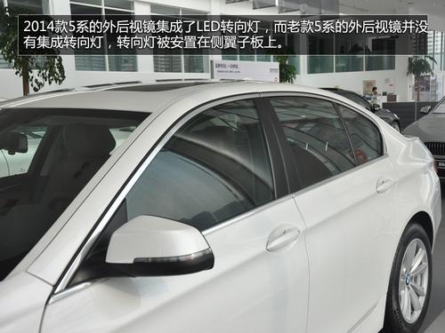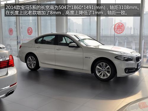 2014款宝马5系的长宽高为5047*1860*1491(mm),轴距3108mm。在长度上比老款增加了8mm,高度上降低了1mm,轴距一致。新5系的外后视镜集成了LED转向灯,而老款5系的外后视镜并没