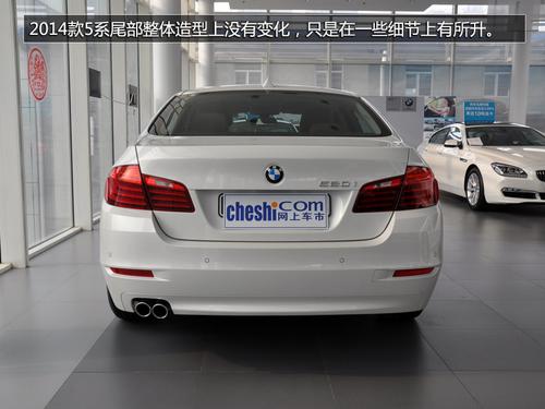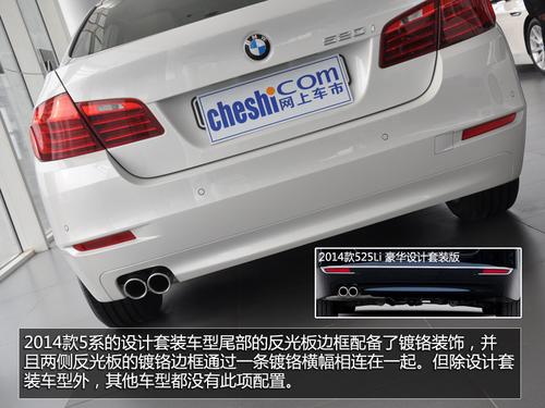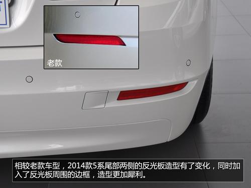 2014款5系的尾灯造型没有变化,但在细节上有所提升,内部进行了熏黑处理,更加时尚,同时发光元件亮度也进行了提升。相较老款车型,2014款5系尾部两侧的反光板造型有了变化,同时加入了反光板周围的边框,造型更加犀利。同时,新5系的设计套装车型尾部的反光板边框配备了镀铬装饰,并且两侧反光板的镀铬边框通过一条镀铬横幅相连在一起。但除设计套装车型外,其他车型都没有此项配置。