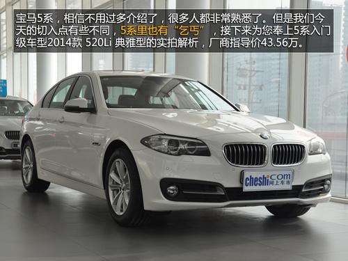 宝马5系,相信不用过多介绍了,很多人都非常熟悉了。但是我们今天的切入点有些不同,5系里也有“乞丐”,接下来为您奉上国产的华晨宝马5系Li入门级车型车型:2014款 520Li 典雅型的实拍解析,厂商指导价43.56万元,看看这款最便宜的长轴距版5系是否合适您的选择。