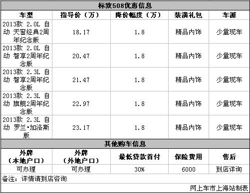 参与互动(0)日前网上车市上海站从上海海标东风标致4S店了解到,目前该店508全系车型优惠出售,具体信息见下表: