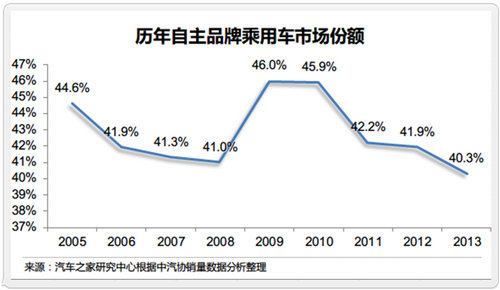 2013年,中国品牌乘用车销量同比增长11.4%,而乘用车总体增长了15.7%,其中中国品牌市场份额为40.3%,较2012年下降了1.6%,这是中国品牌市场份额连续第二年下滑。市场份额下滑的同时,中国品牌车型的利润也有所下滑,虽说没有这方面的统计数据,但面对压力中国品牌当前只有拼价格一招,就北京市场而言,中国品牌经销商日子日渐艰难也从侧面做出了注解。