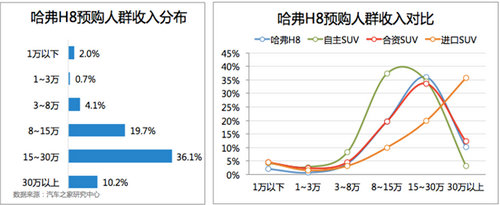 汽车之家另一项数据统计也说明了中国品牌的努力有了成果。数据显示,哈弗H8预购人群年收入在15万元以上的占到了47%,符合中端汽车消费者的特征,接近于合资SUV消费者。价格、质量、空间等要素可以成为哈弗H8的卖点。