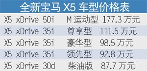 第三代X5在中国率先上市的5款车型中,值得关注的是BMW X5 xDrive 30d,这是宝马首次在中国市场推出柴油版车型,至此,BMW高效动力科技所含的四种动力形式——汽油、柴油、ActiveHybrid混合动力、eDrive电动,全部引入中国。BMW X5 30d搭载3.0升双涡管涡轮增压柴油发动机,最大扭矩560牛米,0~100km/h加速6.9秒,而其综合油耗仅为7.2升/100公里,这对一款大型SUV而言,简直太低了。