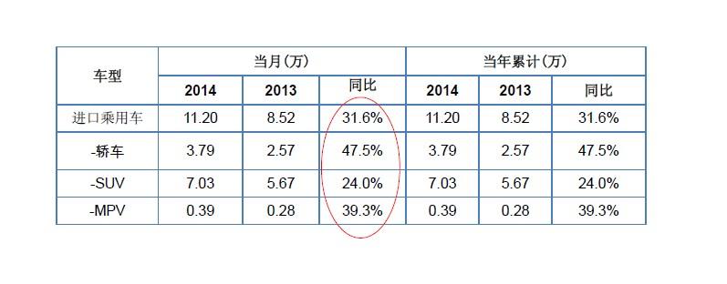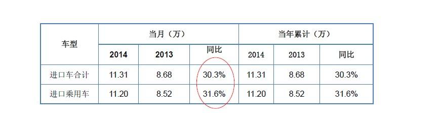 国机汽车数据显示,2014年1月海关汽车进口量为11.31万辆,同比增长30.3%,其中乘用车进口11.2万辆,同比增长31.6%。