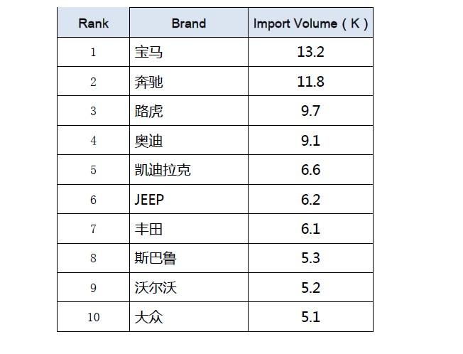 另外,今年1月份,宝马品牌进口数量为13200辆,奔驰品牌11800辆,分别名列前两位。路虎品牌和奥迪品牌进口数量分别为9700辆和9100辆,排在第三和第四位。(记者 朱津津)