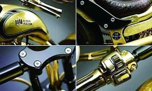 据英国媒体日前报道,据了解,该款摩托车由丹麦著名的摩托制造公司Lauge Jensen打造。特别是整车24K镀金的设计,令人大开眼界。该款摩托车由一辆时速可达250km/h的哈雷摩托改装而成。另外,268颗钻石的镶嵌也令该摩托车身价倍增。另外,先前世界最贵的摩托车为道奇战斧V10超级摩托车,其价格达到60万美元(约合人民币365.5万元)。
