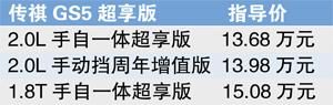 3月3日,传祺GS5超享版车型上市,共三款型号,市场指导价13.68万元起。新车提升静音与动力,并增加胎压监测、定速巡航等配置。动力方面,传祺GS5通过对发动机与变速箱的优化调校,使超享版车型动力表现更出色,0~60km/h加速度时间减少10%,中油门开度加速及中段提速的动力表现均有明显提升。同时,由于变速箱液力变矩传递效率的提高,起步加速性能提升,但油耗却保持不变。传祺GS5 2.0L AT超享版在原2.0L MT舒适版上增加AT自动变速箱、博世最新ESP 9.1系统(含HHC上坡辅助系统)、真皮多功能方向盘、行车电脑、定速巡航,拉低自动版车型入门价格的同时,配置却更加丰富。 传祺GS5 1.8T AT超享版搭载1.8T涡轮增压发动机、HDC下坡辅助,可选装天窗。 (记者周伟力)