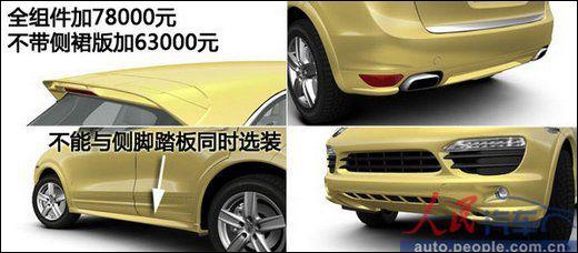 接下来是华丽丽的运动套件。保时捷提供一套运动化效果很强烈的外观套件,叫SportDesign组件。组件中的后扰流板的运动化气息效果最好,是较为值得选装的配件。这套组件需加78000元。但需要注意的是,组件中带有侧裙板,不可以和侧脚踏板一起选装。对于底盘较高的SUV车型来说,脚踏板是比较有用的套件,因此选择不带侧裙板的SportDesign组件,加上侧脚踏板也是比较实在的选择。