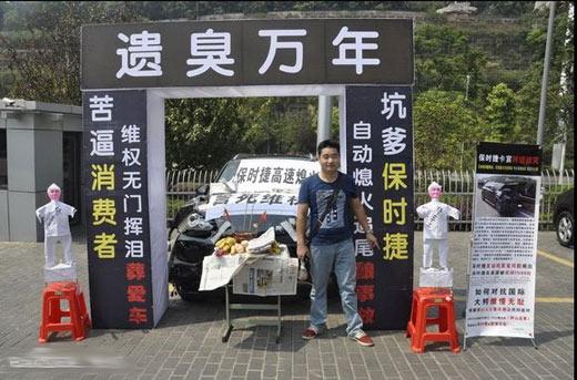 2013年4月,车主郝钢驾驶保时捷卡宴在高速公路紧急制动。按车主的说法,当时刹车失灵、转向失效,直接撞上前车,车辆严重损毁,驾驶席和副驾驶席气囊全部弹出。为此车主要求保时捷给说法,但保时捷以没有证据证明是因为车辆质量问题而导致碰撞而拒绝。于是车主找到第三方鉴定机构做鉴定,最终得出先熄火后碰撞的结果。但保时捷又站出来对第三方鉴定机构的所有检测结果都予以推翻,认为这个机构根本就不了解保时捷汽车构造,得出的结果很不严谨。车主迫于无奈之下,2013年9月,只好走上“野性维权”之路——在保时捷4S店周边摆设灵堂,希望借此能挽回败局。