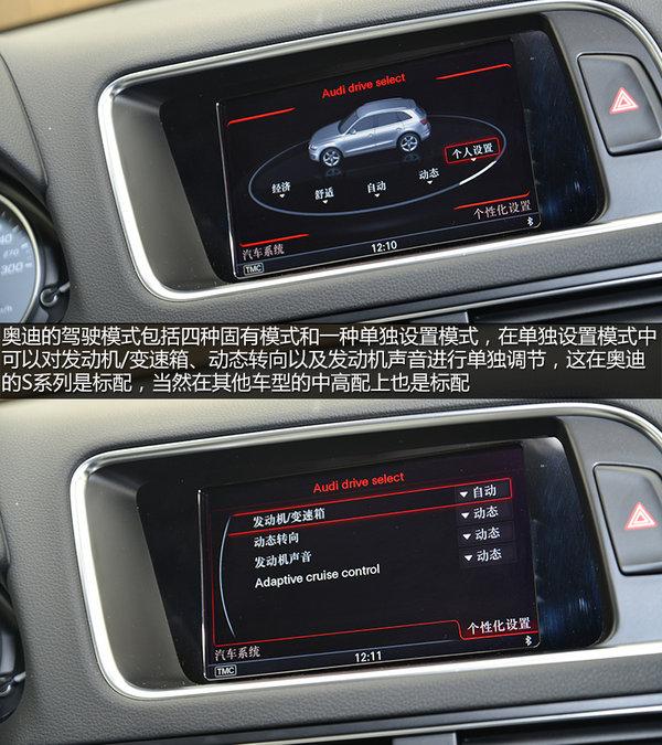 在舒适性上,SQ5依旧是能让人满意,前排座椅加热、MMI系统等都作为标准配置出在SQ5身上,这其实和进口奥迪Q5的配置相差不大了。在驾驶模式上,奥迪独有的驾驶模式选择功能也在SQ5上属于标准配置,驾驶员可以选择四种集成的驾驶模式,也可以单独对发动机声音、转向系统以及变速器等进行单独的调节,定制自己想要的效果。