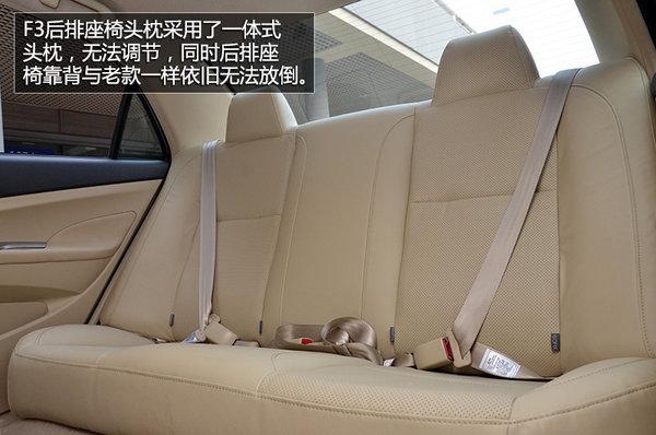 全新F3采用了皮质座椅,并且身体接触部分还有打孔工艺,对于透气性有一定帮助。座椅依旧为手动调节,可调节座椅前后,以及座椅靠背角度调节,共四方向调节。F3后排座椅头枕采用了一体式头枕,无法调节,同时后排座椅靠背与老款一样依旧无法放倒。经过测试者对F3车内的测试,基本能够满足日常家庭使用,空间表现出色。