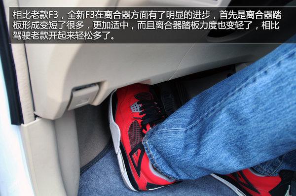 方向盘转向时助力力度略沉,并且助力力度不算非常均匀,对于女性驾驶者可能会有些不好适应。相比老款F3,全新F3在离合器方面有了明显的进步,首先是离合器踏板形成变短了很多,更加适中,而且离合器踏板力度也变轻了,相比驾驶老款开起来轻松多了。