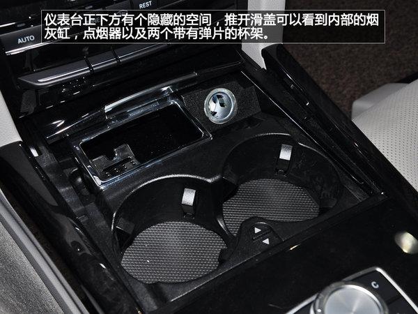 前排中央扶手箱采用对开式设计,使用上更轻松。但是过于纤薄的造型很难对手臂进行有效支撑,舒适度大打折扣。仪表台正下方有个隐藏的空间,推开滑盖可以看到内部的烟灰缸,点烟器以及两个带有弹片的杯架。
