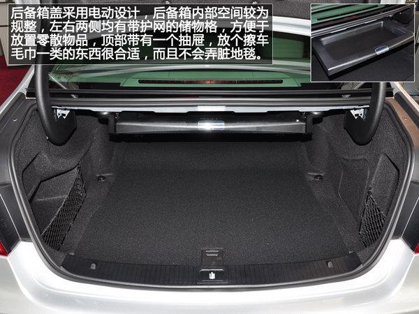 后座中间的靠背可以翻折下来当做中央扶手使用,打开上面盖板后可以使用内部带有防滑处理的储物格和一对隐藏式杯架。后备箱盖采用电动设计,后备箱内部空间较为规整,左右两侧均有带护网的储物格,方便于放置零散物品,顶部带有一个抽屉,放个擦车毛巾一类的东西很合适,而且不会弄脏地毯。