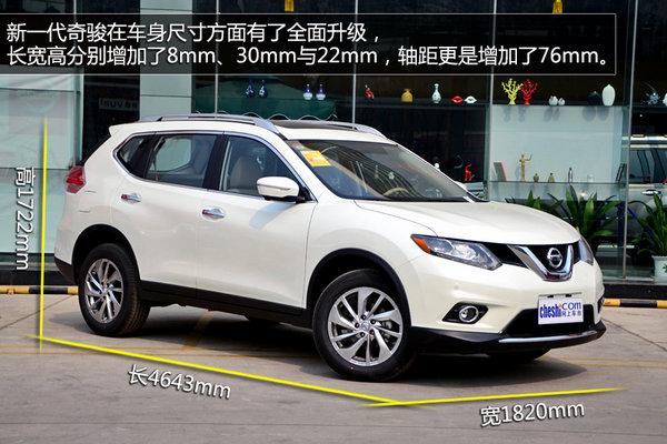 新一代奇骏长宽高为4643mm×1820mm×1722mm,轴距为2706mm。相比现款车型,新一代奇骏在车身尺寸方面有了全面升级,长宽高分别增加了8mm、30mm与22mm,轴距更是增加了76mm,从理论上来讲,新一代奇骏的乘坐空间也将得到显著提升。而在与同级别车型的较量中,新一代奇骏也显示出明显的优势。