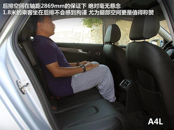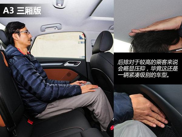 在空间对比上,图中两位模特身高相近,都在180cm左右。前排空间差距并不明显,调整好舒适坐姿后,头部还有一定余量。轴距差距直接体现在后排空间上,A4L腿部空间优势非常明显。由于A3三厢版车型线条原因,后排头部空间有些狭小,而A4L完全没有问题。