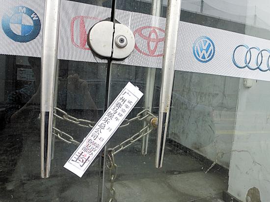 曾经人流熙攘,今日一片萧条。4月6日,清明节时分,记者来到广州乃至华南地区最大汽车交易中心之一的赛马场汽车城,这里绝大多数车商已搬离,只剩下少数几家店仍在开门迎客。在每个搬空的展厅大门上,都有“广州赛马娱乐总公司保卫科”字样的封条,面向黄埔大道的赛马场大门上方,“赛马场美食城”的招牌已替下那块挂了十多年的“赛马场汽车城”招牌。记者了解到,70多家车行因合同到期而搬离,其中多数搬到偏远城郊,也有的就此关门停业。