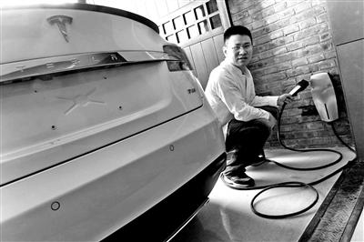 特斯拉为车主汪东风在车库配装了充电桩本版摄影/本报记者 魏彤