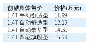 4月19日,雪佛兰版“昂克拉”——创酷上市,共推出搭载1.4L涡轮增压发动机的4款车型,有手动挡和自动挡以及两驱和四驱不同配置的车型可供选择,售价11.99万~15.99万元。