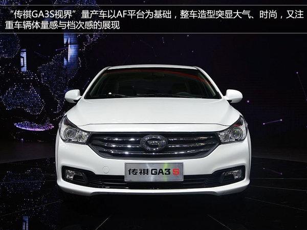 “传祺GA3S视界”量产车以AF平台为基础,整车造型突显大气、时尚,又注重车辆体量感与档次感的展现;采用同级罕见的透镜前大灯与前格栅一体化相连的设计,给人强烈的视觉印象;车身侧面采用镀铬饰条装饰与车身动态双腰线进行呼应;