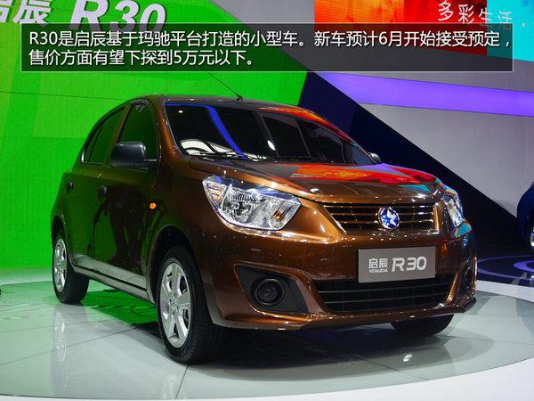 今年2014年的北京车展上,启辰发布新款小型车R30,据了解这款车型的售价市场终端价格将进入5万元以下的区间,新车将在两个月内启动预售,并于9月正式上市销售。而启辰之前多次亮相的晨风纯电动车也将于9月上市。此外现有车型启辰D50、R50也会在4月底推出精彩版车型。