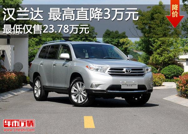 自2009年国产上市以来,广汽丰田汉兰达便凭借大气的外观、宽敞的空间以及较低的价格等优势,取得了不俗的销售成绩。近日,笔者从广汽丰田北京金时伟业4S店获悉,汉兰达最高直降3万元,现车充足。具体如下: