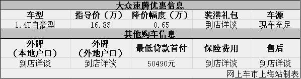 参与互动(0)日前网上车市上海站从上海一汽汽车服务有限公司了解到,目前该店一汽大众速腾优惠出售,详情请见下表: