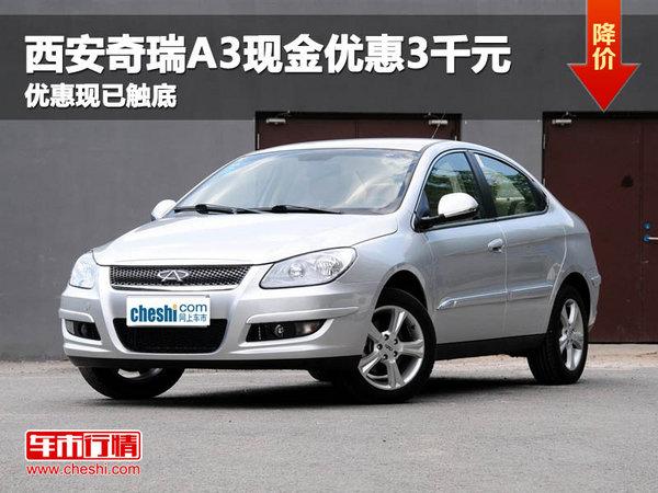 近日,据网上车市西安分站编辑从西安陕西瑞鑫奇瑞4S店获悉,现在购买奇瑞A3将可获得3千元的现金优惠。有意者不妨致电经销商或者到店了解更多信息。