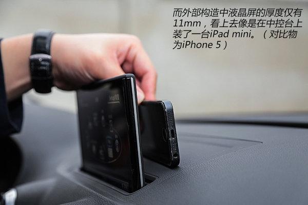 作为车内系统的最终体现,全新液晶屏担负起了重要使命,UI美观性、分辨率、以及所呈现出的系统运转速度都将第一时间反馈给使用 者,为此,设计师使用了一块1.2G的双核处理器与高速图形显卡,以保证系统操作流畅、画质清晰立体。而外部构造中液晶屏的厚度仅有11mm,看上去像是 在中控台上装了一台iPad mini。