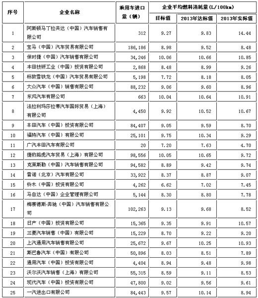 2013年度进口车企平均燃料消耗量