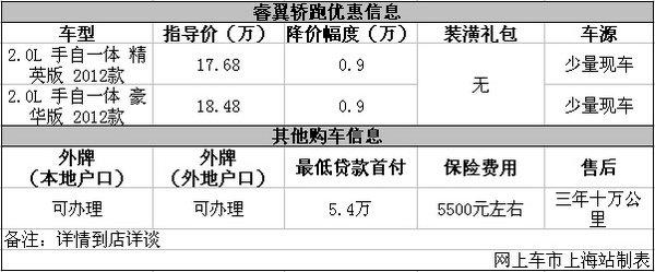 参与互动(0)日前网上车市上海站从上海通锐4S店了解到,目前该店睿翼轿跑车型优惠出售,具体信息见下表: