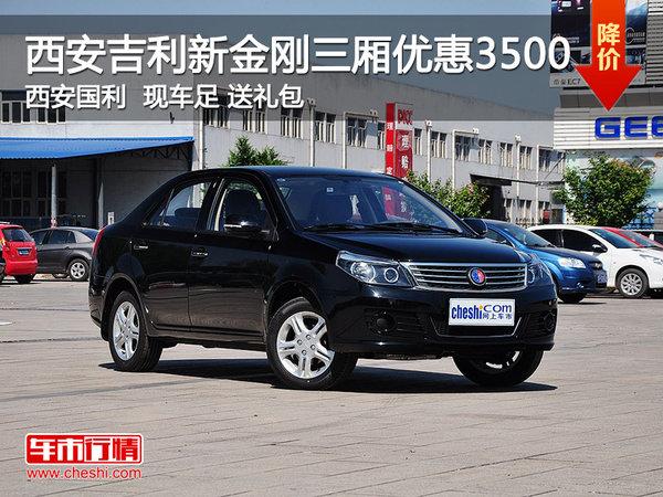 近日,据网上车市西安分站编辑从西安国利汽车4S店获悉,吉利新金刚三厢最高现金优惠3500元,再送脚垫、挡泥板、方向盘套,现车充足,感兴趣的朋友不妨致电经销商或者到店了解更多信息。