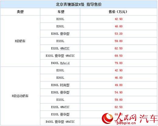 此次上市新车共推出15款车型,新车相比老款车型最大的特点就是E200L和E260L换装了2.0T发动机,同时由配备3.0T低功率发动机的E320L车型取代了此前的E300L车型。新款E级的全系售价区间为42.90万元-79.80万元。详细售价请见下表: