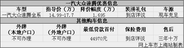 上海:一汽大众速腾现优惠近1.7万元 现车足