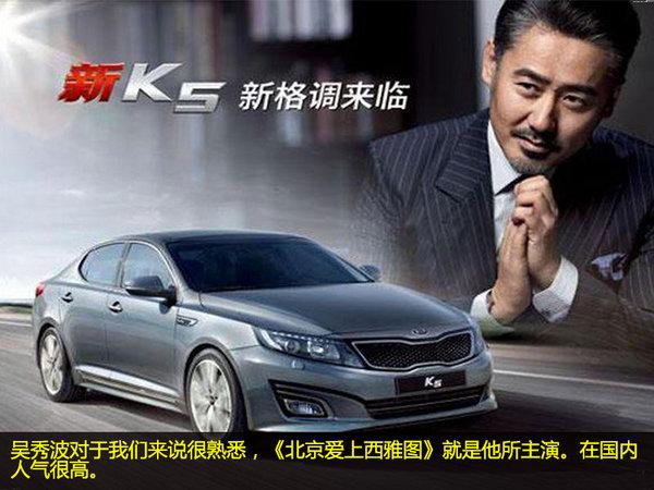 吴秀波新晋成为中国大陆地区新K5形象代言人,厂家希望以其在华语地区的强大号召力,助力东风悦达起亚开启多元营销的新时代。专为拥有成功、享受快乐,品鉴经典而不失热情的时尚精英人群打造的新K5,与其代言人吴秀波低调内敛的性格、高贵优雅的气质、俊朗时尚的外形相吻合。