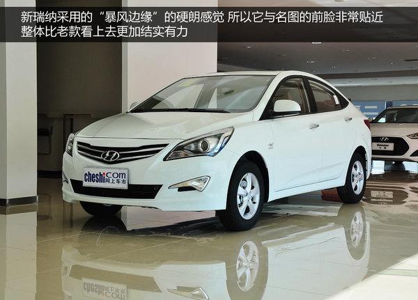 2014款瑞纳的设计已经在贴近目前现代新车所采用的“暴风边缘”的硬朗感觉,所以它与名图的前脸非常贴近,整体比老款硬朗多了。前脸中网风格由之前的黑色塑料更换为现在的镀铬装饰。大灯相比之前硬朗多了,但依旧没有采用透镜,同时还是远近光一体灯泡设计。