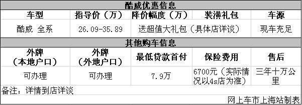 参与互动(0)日前网上车市上海站从上海东昌浦利4s店了解到,目前该店酷威优惠出售,详情请见下表: