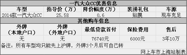 上海:一汽大众CC现优惠让利0.6万元 有现车