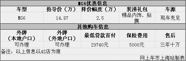上海:MG6现优惠让利2.5万元 送精品内饰等