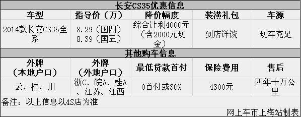参与互动(0)日前网上车市上海站从上海昌顺4s店了解到,目前该店长安CS35优惠出售,详情请见下表: