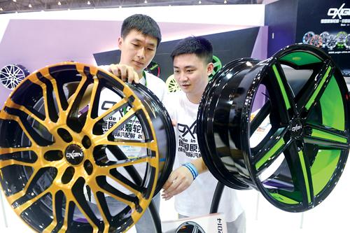 7月21日,首届成都国际汽车零配件及售后服务展览会开幕。展会共吸引来自13个国家及地区的近600家企业参与。展会涵盖汽车零部件、维修与保养、用品及改装等内容,展示汽车行业最新产品及科技。图为零部件企业工作人员在向观众介绍汽车零配件。