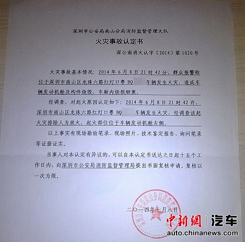 中新网汽车频道记者联系到深圳市公安局南山分局消防监督管理大队,负责杨先生车辆火灾救援的黄警官告诉记者,6月8日确有一辆凯美瑞发生过自燃事故,已经排除人为因素,并曾出具《火灾事故认定书》给车主。