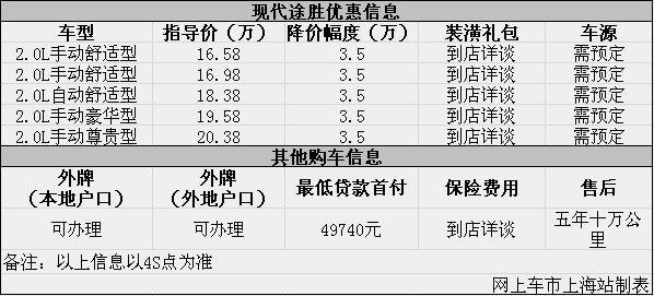 日前网上车市上海站从北京现代汽车百联逸仙4s店了解到,目前该店现代途胜优惠出售,详情请见下表: